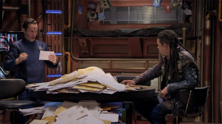 Second weekend clip posted. The code is ‘ASTRONAVS’ News Posted by Jonathan Capps on 15th September 2012, 11:10 GO. This week we have a Rimmer and Lister scene, showing them sifting through the contents of what can only be a post pod delivery. More thoughts on this and other bits after the jump. First, THE CLIP. In a scene that definitely brings to mind a certain scene from Better Than Life, Lister and Rimmer are sifting through the contents of a post pod. After a discussion about who might have more mail (just like Better Than Life), Rimmer finds a letter for him that actually turns out to be a notice of money owed (just like Better Than Life). Derivativeness aside it’s still a funny scene, with Chris especially bringing in the lols. Interestingly, the ‘countdown’ theme of these weekend repeats also seem to apply to these episode clips. Make of that what you will. In today’s first ad break we were also treated to two new Dave bumpers, one featuring Rimmer cleaning the Dave logo and another with the Cat spraying it with his own piss and declaring it his. AMUSING. Presumably there’ll be another two of these to spot throughout the weekend. My predictions are Kryten will fuck the logo with his groinal attachment and Lister will pour curry sauce all over it and then eat it, the silly slob. Finally, the main series trailer has been tweaked slightly. Now, instead of ending with Lister finding a poppadom in his card, it is replaced with a short scene of him trapped outside the ship without his keys, signalling to Kryten to let him in. It’s definitely a much stronger ending to the trailer, and one I greatly approve of. Nice effect, too. Addendum: Clare Grogan is shit in Psirens.