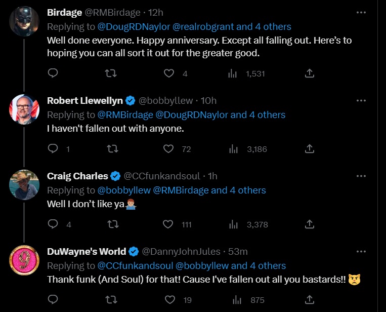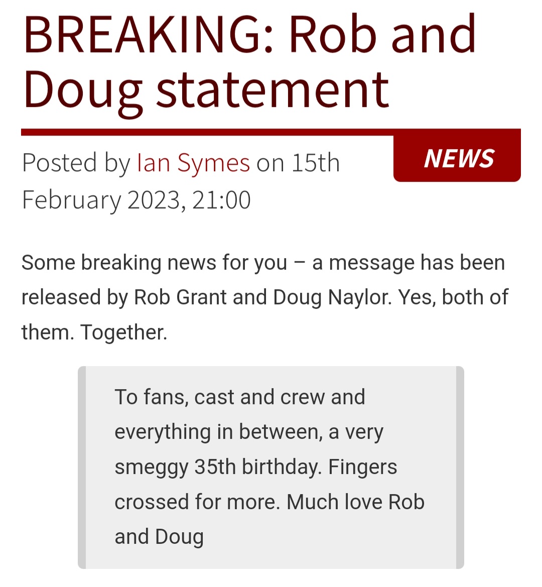 BREAKING: Rob and Doug statement News Posted by Ian Symes on 15th February 2023, 21:00 Some breaking news for you – a message has been released by Rob Grant and Doug Naylor. Yes, both of them. Together. To fans, cast and crew and everything in between, a very smeggy 35th birthday. Fingers crossed for more. Much love Rob and Doug There is certainly a lot to discuss, so head on over to our Coral Canvass Livestream Spectacular right now, for all the reaction to this and today’s poll results, plus a lovely game of the wholly original Red Dwarf quiz Clochebusters!
