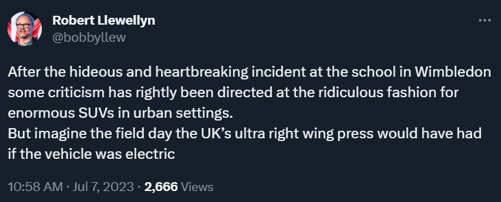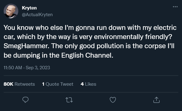 Home › Forums › Ganymede & Titan Forum › Robert Llewellyn has updated his Substack Search for: This topic has 266 replies, 39 voices, and was last updated 1 month ago by applemask. Scroll to bottom Creator Topic April 8, 2023 at 6:01 pm #283750 Stephen AbootmanParticipant https://llewellyn.substack.com/p/am-i-woke Hopefully Craig will update his TikTok next unless Norman Lovett has an OnlyFans to put forward his views on wokery etc. Creator Topic Viewing 50 replies - 101 through 150 (of 266 total) 1 2 3 4 5 6 Author Replies September 1, 2023 at 7:43 pm #288400 RudolphParticipant September 1, 2023 at 9:21 pm #288403 MoonlightParticipant September 1, 2023 at 11:34 pm #288408 UnrumbleParticipant September 2, 2023 at 7:12 am #288416 UnrumbleParticipant September 2, 2023 at 10:05 pm #288462 Jonathan CappsKeymaster Get what people call you right, Bobby, there’s a bag of chips in it for ya. September 3, 2023 at 6:47 am #288471 UnrumbleParticipant September 3, 2023 at 9:04 am #288474 DaveParticipant The man’s Bob-obsessed. Bobsessed. September 3, 2023 at 9:15 am #288475 Frank SmeghammerParticipant Get what people call you right, Bobby, there’s a bag of chips in it for ya. I did that one already goddammit and it flew under the radar September 3, 2023 at 9:48 am #288477 Future Producer of Series IX – aaaaany day nowParticipant Who are you again? September 3, 2023 at 10:51 am #288479 Frank SmeghammerParticipant Who are you again? Oh no, we’re going through an Unreality Bob-ble September 3, 2023 at 12:20 pm #288480 MoonlightParticipant September 3, 2023 at 5:49 pm #288485 Flap JackParticipant The Wikipedia page for Tesla, Inc. has 3 whole sections entitled “Lawsuits and controversies”, “Criticism” and “Vehicle product issues” respectively – as well as having like 4 breakout articles – yet here Robert makes it sound like people are expressing preferences for other electric vehicle companies just to be contrarian. September 3, 2023 at 7:57 pm #288486 RudolphParticipant September 3, 2023 at 8:31 pm #288489 Jonathan CappsKeymaster This is a fairly good example of the electric car brain worms. This is what being single issue does to you, you can’t ever see past it. September 3, 2023 at 8:55 pm #288490 MoonlightParticipant Why can’t he devote this energy into a revolution against the oligopoly? September 3, 2023 at 9:08 pm #288491 Jonathan CappsKeymaster Because games of Oligopoly take too long to finish and he’s too busy asking ChatGPT to generate bland Kryten tweets September 3, 2023 at 10:22 pm #288493 Flap JackParticipant In July I thought he was defending theoretical electric SUV owners from being defamed by association, but with the recent tweet in mind I can now see he just thinks electric SUV owners are losers that are ruining things for the rest of the electric car community. Even within the confines of his chosen single issue, it’s pretty bizarre that Robert thinks about hypothetical scenarios where electric vehicles might be unfairly blamed for accidents, yet he seems to pretty much ignore Tesla’s many high profile fuck-ups when it comes to safety. “Ooh, can you IMAGINE what the right wing press would say if a vehicle that killed someone happened to be electric??” Well Bobby, that is not actually a hypothetical scenario, so as long as the vehicle was a Tesla, I can confidently say that the right wing press would either not care at all, chalk it up as a freak occurrence, or claim that such accidents are the price of progress. The right wing press aren’t opposed to electric cars because they’re electric; they side with power and wealth. September 3, 2023 at 10:39 pm #288495 DaveParticipant Well Bobby September 4, 2023 at 11:41 am #288515 Nick RParticipant 🎵 His name is Bobby (oo-ooh) Bobby Llewellyn (aa-aah) He’s a lovely per-soin (oo-ooh) But not a very good Actual (Kryten) 🎵 September 4, 2023 at 11:54 am #288516 DaveParticipant 🎵 His name is Bobby (oo-ooh) Bobby Llewellyn (aa-aah) He’s a lovely per-soin (oo-ooh) But not a very good Actual (Kryten) 🎵 But when he is not Kryten… It is said he is boring… But I do not believe this… It is [people who hate electric vehicles] who are boring…. September 4, 2023 at 2:52 pm #288519 JenuallParticipant Warning! The Bobby Llewellyn twitter account is a single issue feed, start eye-rolling now! September 4, 2023 at 5:46 pm #288525 cwickhamParticipant Bobby, Bobby, Bobby Llew If his socials don’t scare you, Chris Barrie’s will September 4, 2023 at 5:50 pm #288526 MoonlightParticipant Bobby, Bobby Llew will getcha Run you down in his blue Tesla September 4, 2023 at 8:41 pm #288530 Quinn: Clochebusters World ChampionParticipant September 5, 2023 at 12:48 am #288533 International DebrisParticipant Adam and Joe content massively appreciated here, lovely stuff. September 5, 2023 at 7:14 am #288539 UnrumbleParticipant September 5, 2023 at 10:19 am #288545 Nick RParticipant September 5, 2023 at 12:00 pm #288548 DaveParticipant September 5, 2023 at 12:06 pm #288549 Jonathan CappsKeymaster September 5, 2023 at 8:19 pm #288558 Frank SmeghammerParticipant September 6, 2023 at 5:34 am #288580 MoonlightParticipant September 6, 2023 at 1:20 pm #288589 tombowParticipant September 6, 2023 at 8:14 pm #288598 Stephen AbootmanParticipant September 16, 2023 at 3:30 pm #288944 Stephen AbootmanParticipant Important update, please read: September 16, 2023 at 3:39 pm #288945 Jonathan CappsKeymaster He a serious issue with his programming, Paul Barron September 16, 2023 at 3:50 pm #288947 Quinn: Clochebusters World ChampionParticipant Actual Kryten responding to allegations in an upcoming episode of Dispatches. September 17, 2023 at 1:10 am #288951 MoonlightParticipant September 17, 2023 at 12:47 pm #288968 Frank SmeghammerParticipant September 17, 2023 at 2:28 pm #288970 UnrumbleParticipant September 17, 2023 at 6:57 pm #288983 RudolphParticipant September 17, 2023 at 10:27 pm #288987 International DebrisPa
